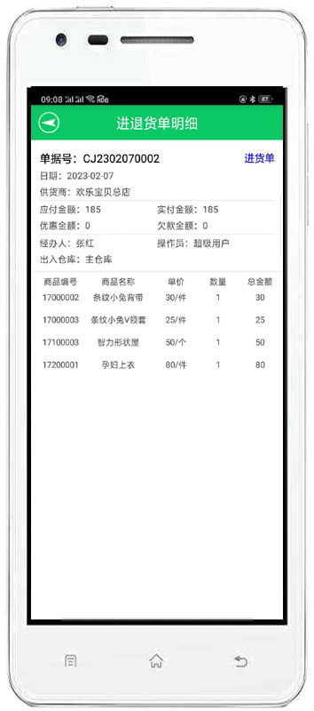 | 进货管理:进行商品采购入库,采购退货,进/退单据和当前库存查询,与供货商的往来帐务。 | |||