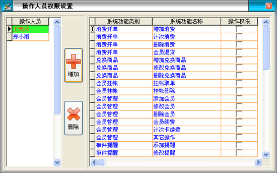 | ·点击菜单“系统维护→操作权限”进入操作权限设置界面。 ·进入“操作人员权限设置”窗口中,如需增加操作人员,请点击“增加”按钮,录入操作人员名称和操作密码,注意操作人员名称不能相同。 ·如需删除某操作人员,请点击“删除”按钮。 ·系统默认操作人员所有权限为“不允许操作”,如允许某项操作,请点击该项“不允许操作”,显示“是否允许操作”前点击打勾即可。 |