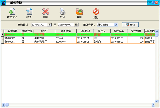 | 在车辆管理中点击“维修登记”进入维修登记界面如图: