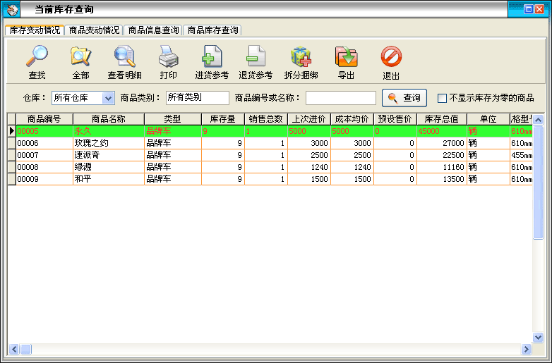 在进货管理中点击“当前库存查询”按钮打开库存查询窗口: