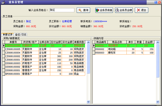 业务员业绩情况:以表格形式在'单据记录'栏内显示该业务员经办的采购、采购退货、客户付款记录、商品销售、销售退货、客户付款情况,在'详细内容'栏内显示相应'采购'或'销售'等记录所对应的详细商品信息;