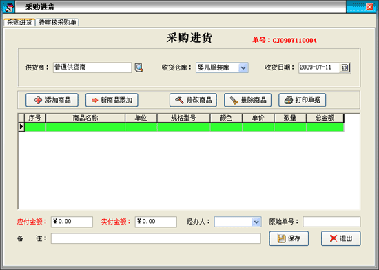 在窗口中可以看到红字为单号,单号由四部分组成如CJ0906180001,前两位“CJ”是采购进货单据的标志,“090618”是09年6月18号增加的单据,“0001”是流水帐号。选择供货商名称、进货仓库及经办人。点击“增加商品”按钮出现增加商品窗口:
