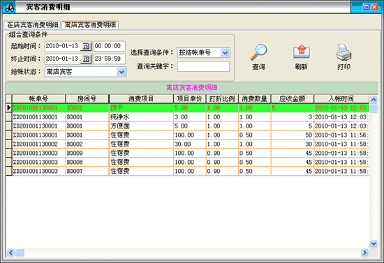 此模块用来查询当前在店消费宾客已记录在册的消费清单(一般根据宾客的要求或某种特殊需要会用到此模块)。