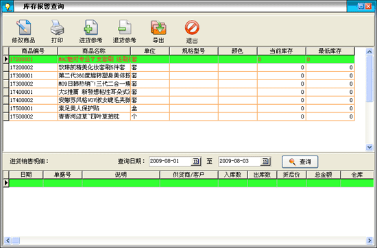 | 2.5.4 库存报警查询:该部分显示库存数量低于系统设定的最低库存的商品。 | |||