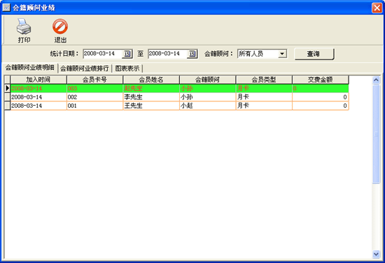 | 在该窗口中可以查询出所有会籍顾问的业绩情况,共分为三个部分:会籍顾问业绩明细、会籍顾问业绩排行、图表显示。 |