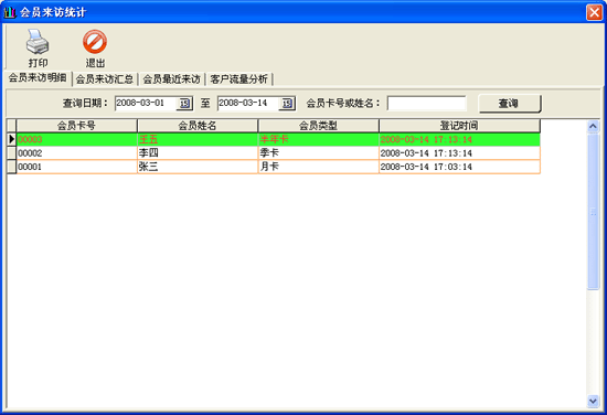 | 在会员管理中点击“会员来访统计”进入会员来访统计界面如图: | |||