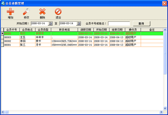 | 在会员管理中点击“会员请假”进入会员请假界面如图: | |||