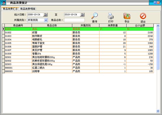 | ·点击菜单“统计报表→商品消费统计”进入商品消费统计界面。 ·进入“商品消费汇总”窗口中,系经统默认显示在数据表中的消费数据为当天的消费汇总情况。可以选择需要查询“统计日期”的起始日期和截止日期,在“所属类别”后的下拉框中选择需要查询的类别,在“商品名称”后的文本框中输入想查询的条件,点击“查询”按钮即可在本窗口中的数据窗口中显示出符合查询条件的信息。点击“打印”按钮,可将当前数据表中显示的数据打印输出到已连接并能正常工作的打印机上。点击“退出”按钮,退出本窗口。 ·进入“商品消费明细”窗口中的操作方式同上。 |