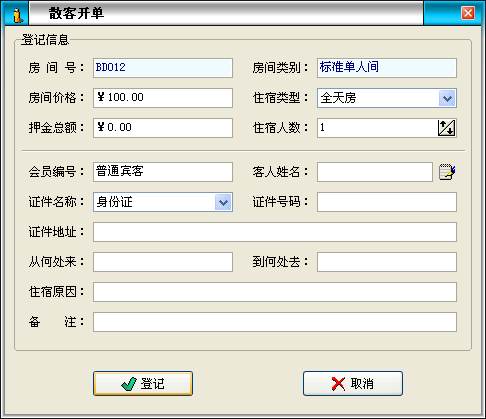 ·在选定某一处于“可供”或“预订”状态的房间后,通过点击菜单“散客登记(团体登记)→开单”进入顾客开单界面。 |