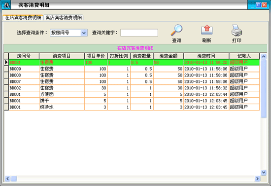 此模块用来查询当前在店消费宾客已记录在册的消费清单(一般根据宾客的要求或某种特殊需要会用到此模块)。