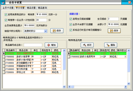 如图是积分设置模块,在该窗口中可以设置普通商品和特殊商品的积分情况以及提醒设置情况。