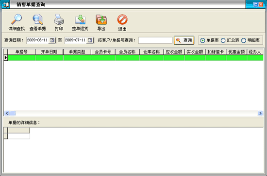 在窗口中的“单据号”后的文本框中输入销售单或销售退货单的单据号、原始单号进行查询。上边的列表中显示的是所查询到的单据,下边的列表中显示的是该单据对应的详细情况。点击“查询”按钮打开查询窗口: