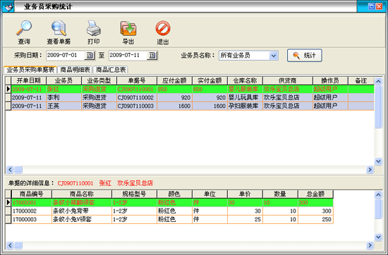 | 2.6.2 业务员采购统计:该报表对针对不同的业务员在一定时间段内的采购进、退货记录作以统计。 | |||