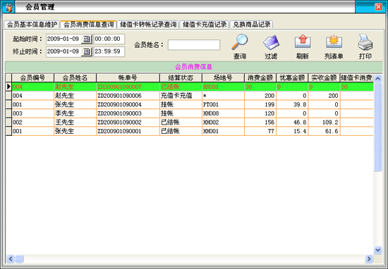 | ·点击菜单“会员管理→会员消费信息”进入会员消费信息界面。 ·进入会员消费信息窗口中可指定会员的编号或姓名来查询符合条件会员的所有消费记录,选中某次消费记录点击“列清单”按钮,可列出此消费记录的消费信息并显示在打印预览窗口中进行打印。 ·可对本窗口数据表中的数据进行打印。 |