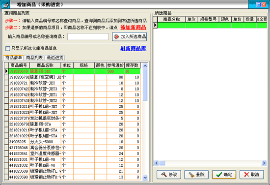 在窗口中可以看到红字为单号,单号由四部分组成如CJ0906180001,前两位“CJ”是采购进货单据的标志,“090618”是09年6月18号增加的单据,“0001”是流水帐号。选择供货商名称、进货仓库及经办人。点击“增加商品”按钮出现增加商品窗口: