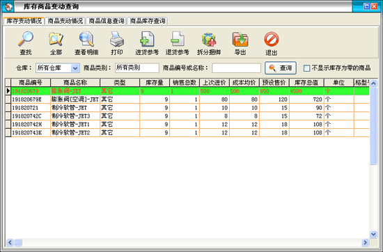 库存查询窗口共分两部分,一是库存变动查询,另一个是商品变动查询。在库存变动查询中列表中显示的是库存商品的信息比如库存数量,库存成本价,库存总价等,在“商品编号或名称”后输入商品编号或商品名称来查询相应商品的库存信息。点击“查询”按钮打开查询窗口,在窗口中选择相应的条件更准确的查询库存。点击“全部”按钮会列出所有库存中的商品。点击“查看明细”按钮打开明细窗口: