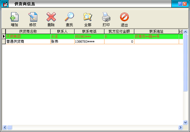 在基本设置模块中点击“供货商信息”按钮打开供货商信息窗口。在窗口中可以看到所有的供货商。点击“增加”按钮打开增加供货商窗口,输入供货商的信息,供货商名称不能重复。如果该供货商有期初金额就在“期初应收”后输入相应的金额。点击“修改”按钮可以修改选中的供货商信息。点击“删除”按钮可以删除选中的供货商,如果该供货商有业务发生则不能删除。系统有一个“普通供货商”是不能被删除的。点击“查找”按钮打开供货商查询窗口,输入相应的条件查询不同的供货商信息。点击“全部”按钮可以列出所有的供货商信息。