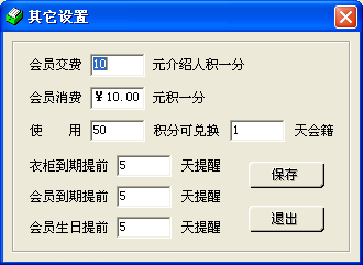 | 对本软件一些基本信息的设置,包括有:会员类型设置、衣柜设置、员工设置、其它设置。 | |||