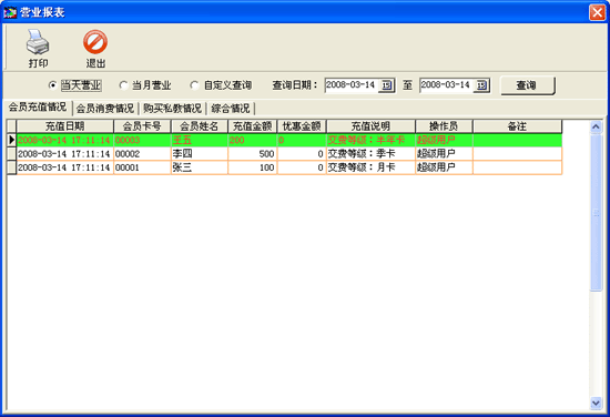 | 在窗口中可以根据日期显示出相应会员充值的情况。 |