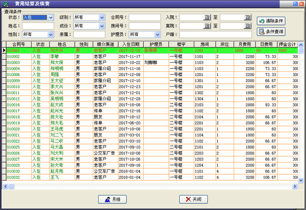 模块功能:公寓老人一览表 ,提供多种查询方式,功能请参阅下章“入住管理”。区别此处仅有查询权限,不允许修改,供客服人员使用。