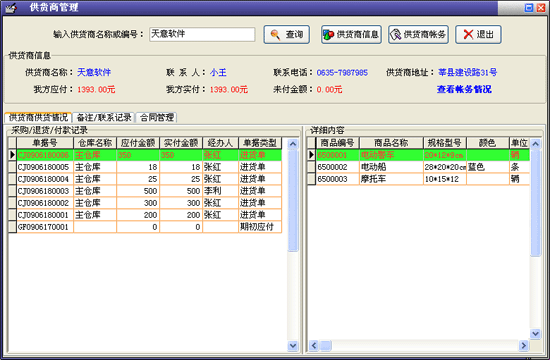 供货商供货情况:以表格形式在'采购/退货/付款记录'栏内显示我方与当前供货商发生的商品采购、退货、付款记录,在'详细内容'栏内显示相应'采购'或'退货'记录所对应的详细商品信息;