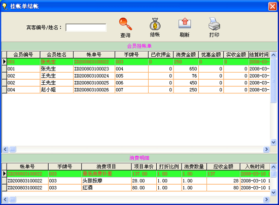 用于查询结帐单消费及结算情况。