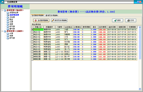 | 第四步:进入“收费管理-->生成物业费”,定期进行物业费的抄表和核算工作。 | |||